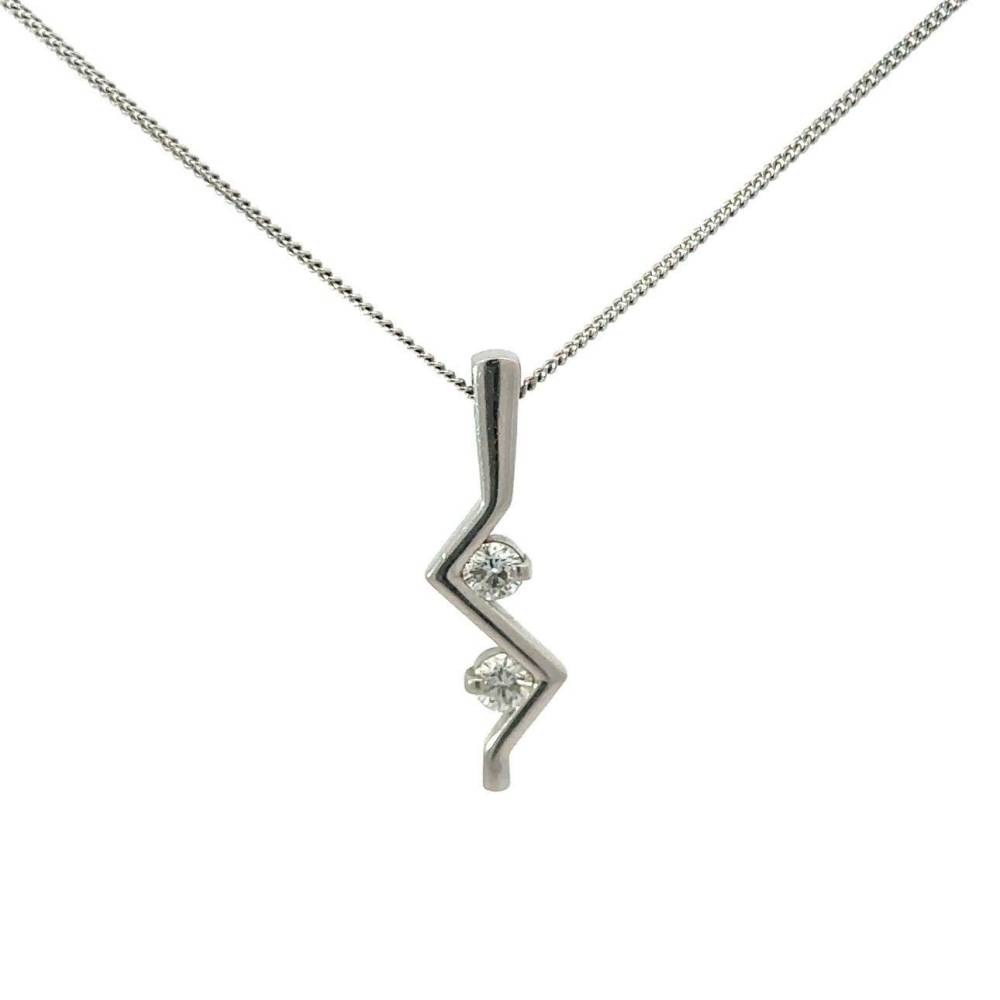 Platinum zig zag shaped drop pendnat set with two round brilliant cut diamonds. This pendant comes on a 16″ platinum chain.