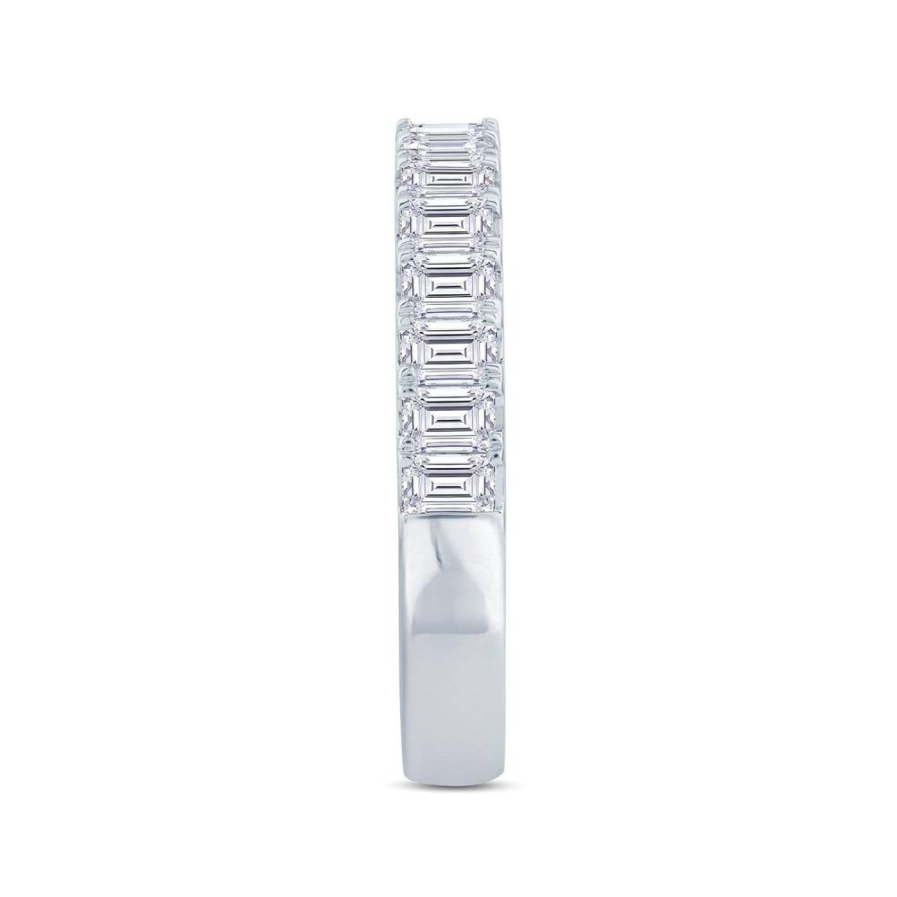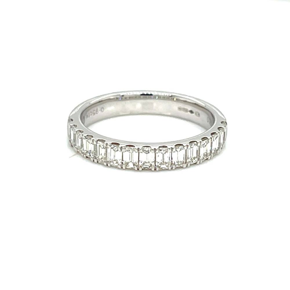 Emerald cut diamonds sit side by side in four claw settings in this platinum half eternity ring. 0.95ct total diamond weight. F/G colour and VS quality diamonds.