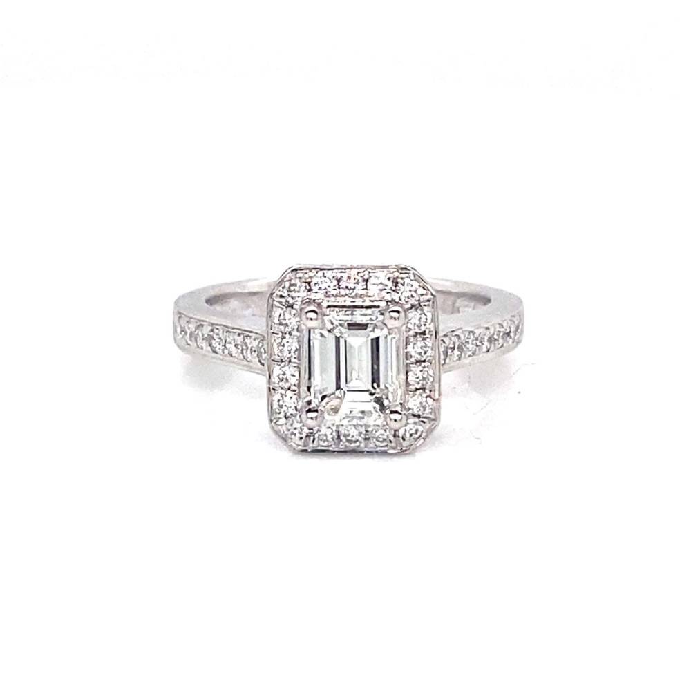 An emerald cut diamond sits in the centre of a round brilliant cut grain set diamond halo in a platinum ring mount with grain set diamond set shoulders. 0.76ct emerald cut diamond, approximatley G/H colour, VS clarity. Other diamonds 0.34ct total weight.