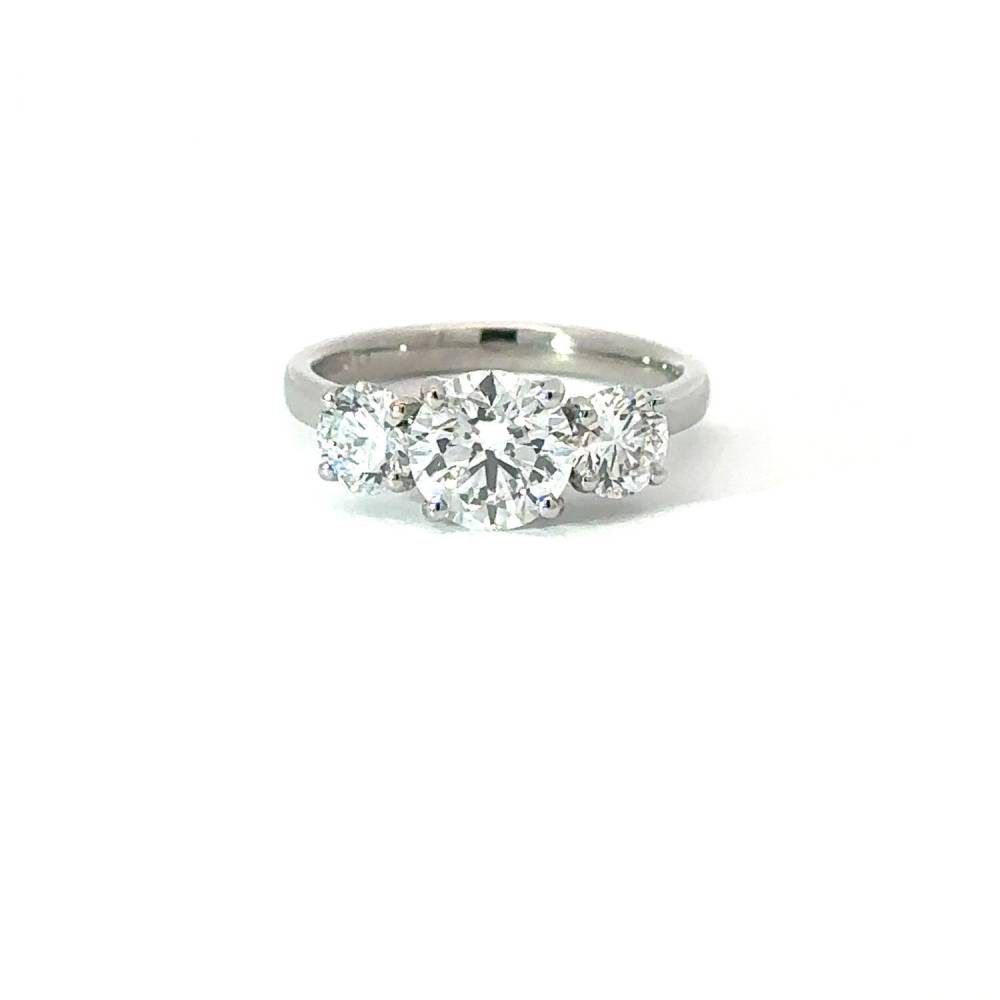 Three graduated round brilliant cut lab grown diamonds each four claw set in a platinum ring mount. All diamonds are lab grown and all are IGI certificated. Centre lab grown diamond 1.52ct, F colour, VS2 clarity. 2x 0.50ct lab grown diamonds F colour, VS2 clarity. A beautiful ring for a fraction of the price of a natural diamond ring of the same size and quality. Read our blog lab grown diamonds to find out more about them.