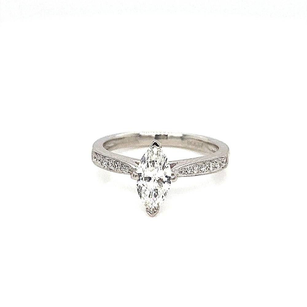 A single marquise cut diamond four claw set in a platinum ring mount with millegrain set diamond set shoulders. Marquise diamond 0.62ct, GIA certificated, G colour, Si1 clarity. 0.08ct total shoulder diamond weight.