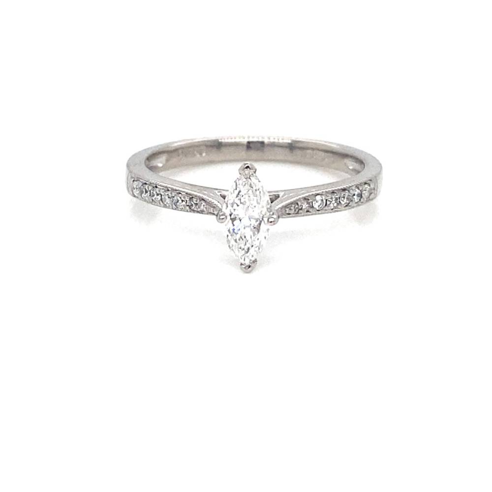 A single marquise cut diamond set in a platinum mount with grain set diamond set shoulders. 0.30ct marquise diamond, GIA certificated F colour, Si2 clarity. 0.08ct total shoulder diamond weight.
