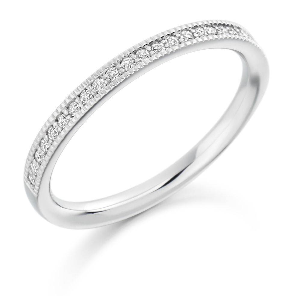 Platinum very narrow round brilliant cut diamond half eternity style ring with a delicate millegrain edge. Band width 2mm. Total diamond weight 0.15ct. Diamond quality H colour, Si clarity. This ring is also avaliable in other metals please call or call in the shop for prices.