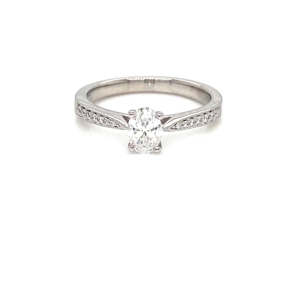 Single oval diamond four claw set in a platinum ring mount with millegrain set diamond set shoulders. 0.42ct oval diamond, E colour, Si2 clarity, GIA certificated.