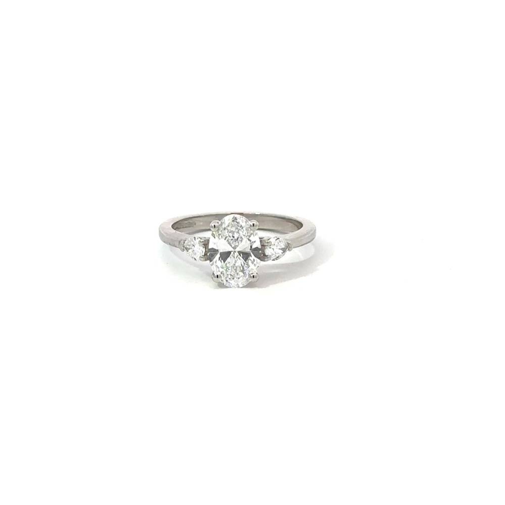 A central oval cut lab grown diamond sits in the centre of two pear shaped lab grown diamonds all claw set in this platinum ring. 1.80ct total diamond weight, centre lab grown diamond 1.50ct, IGI certificated D colour, VS1 clarity.