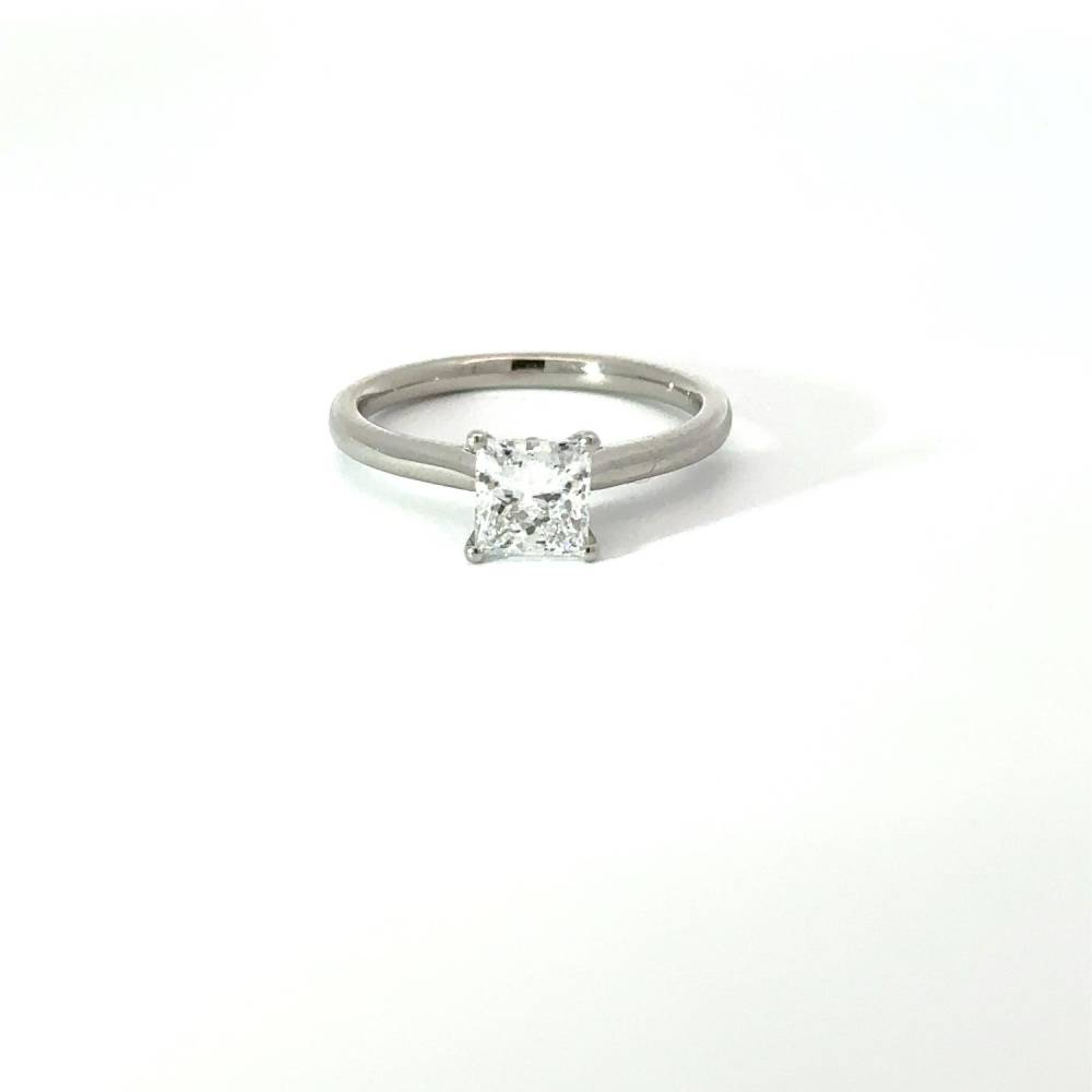 A single princess cut lab grown diamond four claw set in a platinum ring mount. 1.01ct lab grown diamond, IGI certificated E colour, VS2 clarity. Please read our blog to find out more about lab grown diamonds.