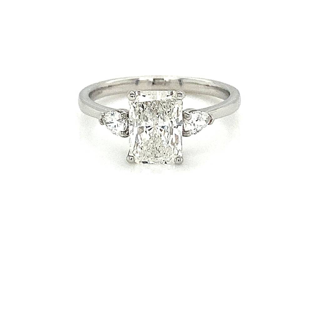 A single 1.60ct radiant cut diamond sits in a simple four claw setting between two pear shaped diamonds. A timeless and beautiful design. 1.60ct radiant cut diamond, IGI certificated G colour, Si2 clarity. Pear shaped diamonds 0.25ct total weight.