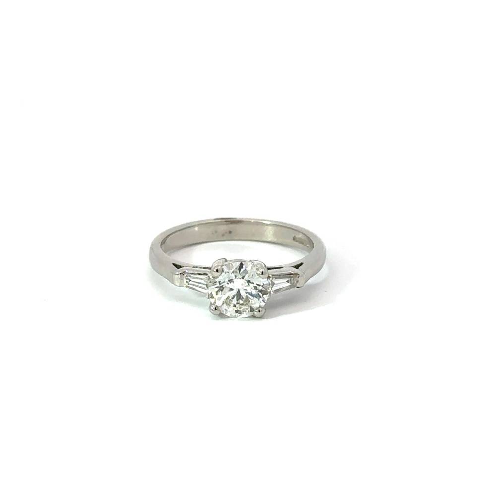 Three stone diamond ring, a central round brilliant cut diamond with a tapered baguette cut diamond either side in a platinum ring mount. 1.00ct round brilliant cut diamond, GIA certificated I colour, Si2 clarity. 0.17ct total baguette diamond weight.