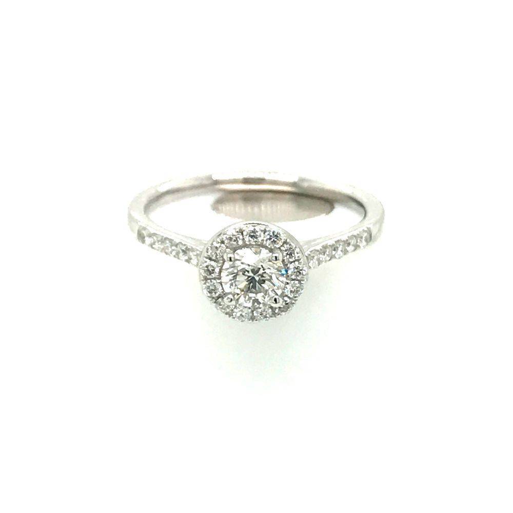 A central round brilliant cut diamond four claw set surrounded by a halo of smaller round brilliant cut diamonds with diamond set shoulders. Central diamond 0.53ct G colour, Si1 clarity on a ring certificate. Other diamonds 0.29ct total weight.