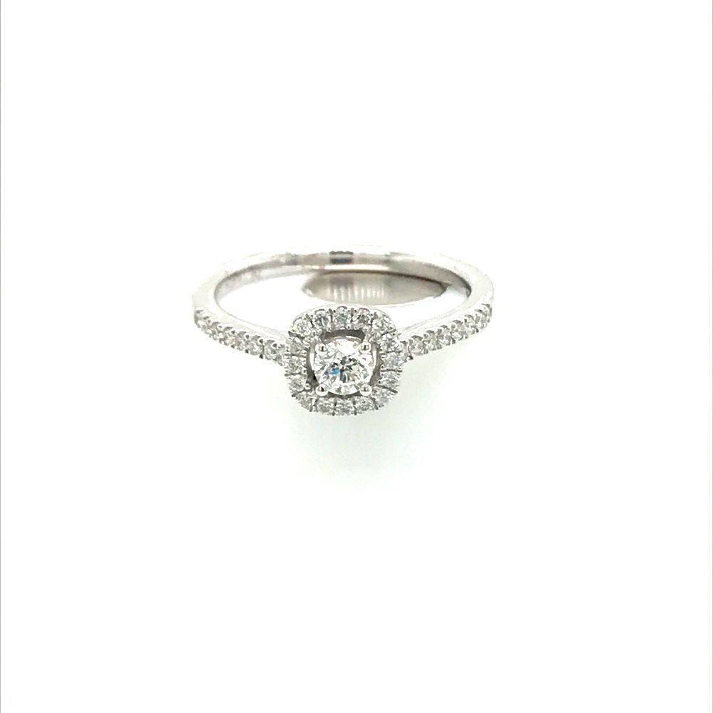 A central round brilliant cut diamond four claw set surrounded by a cushion shaped halo of smaller round brilliant cut diamonds with diamond set shoulders. Total diamond weight 0.37ct. This ring comes with a ring certificate, H colour, Si2 clarity.
