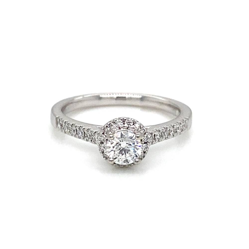 Platinum round brilliant cut diamond halo ring, a central round brilliant cut diamond surrounded by a halo of smaller round brilliant cut diamonds with diamonds set in the shoulders. Centre diamond 0.35ct, GIA certificated E colour, Si2 clarity. Other diamonds 0.17ct total weight.