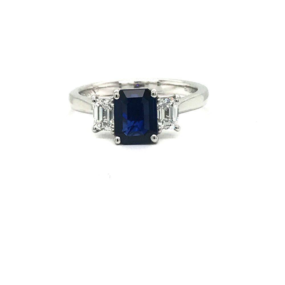 Platinum three stone sapphire and diamond ring. A central octagonal cut blue sapphire with a octagonal cut diamond either side in a claw setting. Sapphire 1.34ct and diamonds 0.61ct total weight.