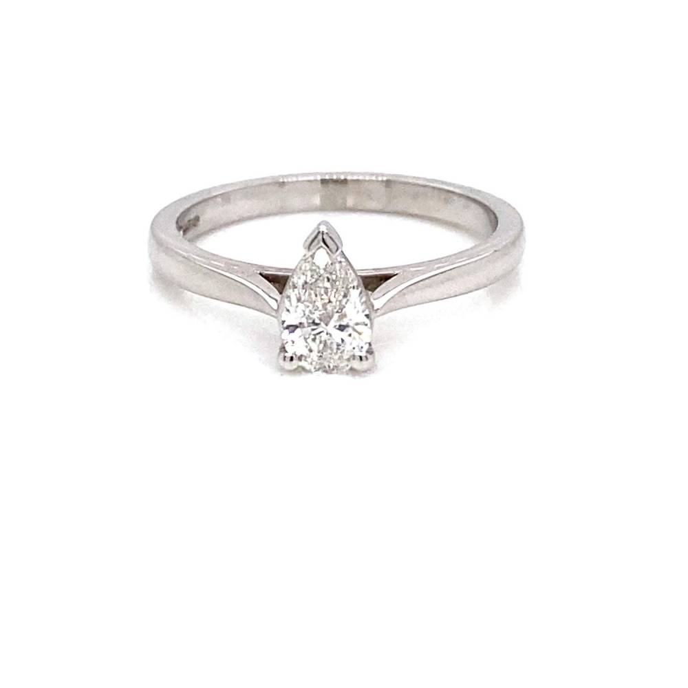 A single pear shaped diamond claw set in a platinum ring mount. 0.50ct diamond, IGI certificated F colour, Si1 clarity.