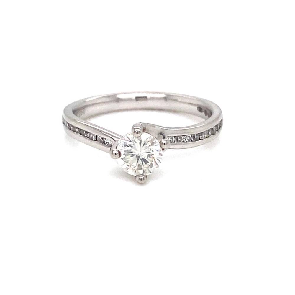 A single round brilliant cut diamond four claw set on a twist with diamonds channel set in each shoulder. 0.52ct diamond, H colour, Si2 clarity.