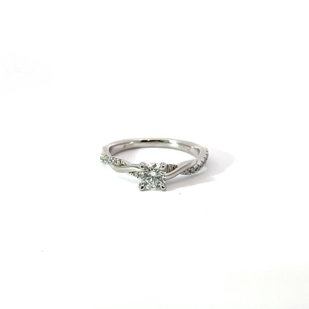 A single round brilliant cut diamond four claw set in platinum with twisted diamond set shoulders. 0.50ct diamond, GIA certificated F colour, Si1 clarity, Other diamonds 0.18ct