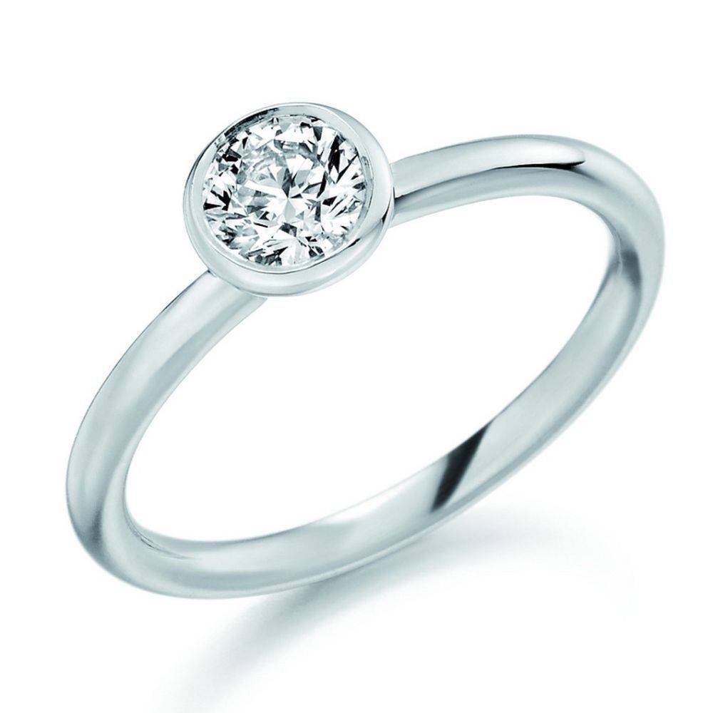 Platinum single stone round brilliant cut diamond ring in a contemporary rub over setting. Diamond 0.50ct, H colour, Si2 clarity. GIA certificate. (Image not to scale)