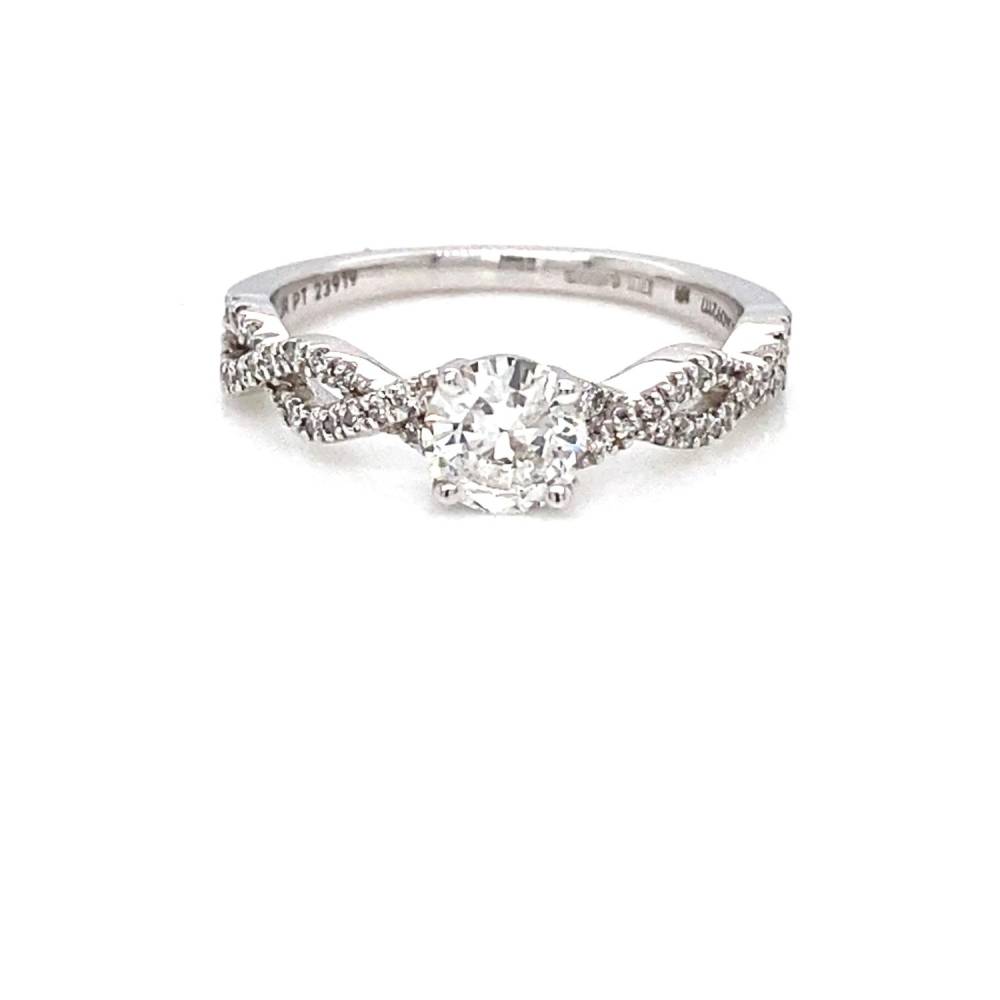 A single round brilliant cut diamond four claw set in a platinum ring mount with fancy open twisted diamond set shoulders. 0.51ct centre diamond, F/G colour, I1 clarity, 0.15ct total other diamond weight.