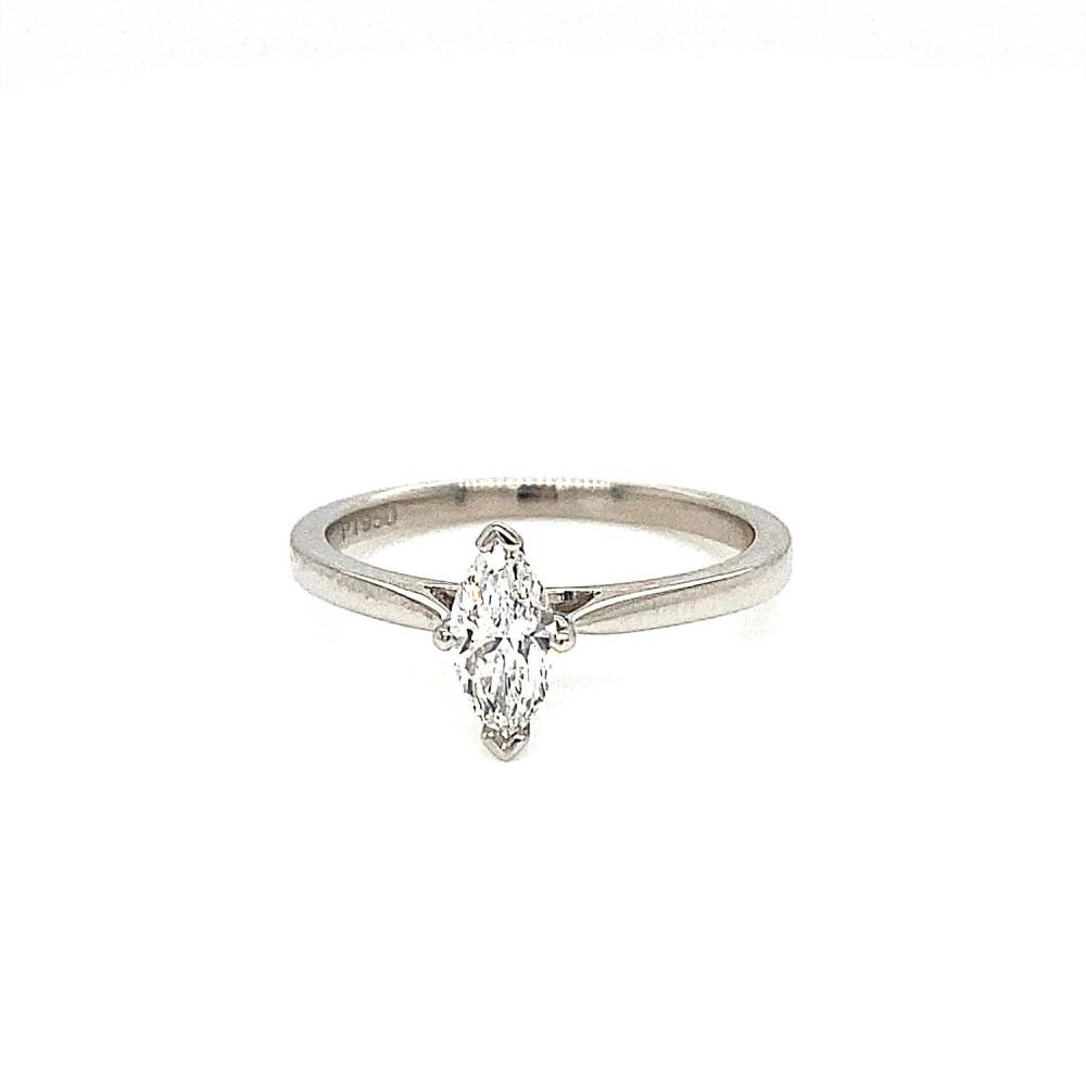 A single marquise cut diamond in a classic four claw setting in a platinum ring mount. 0.41ct diamond, GIA certificated E colourm Si1 clarity.