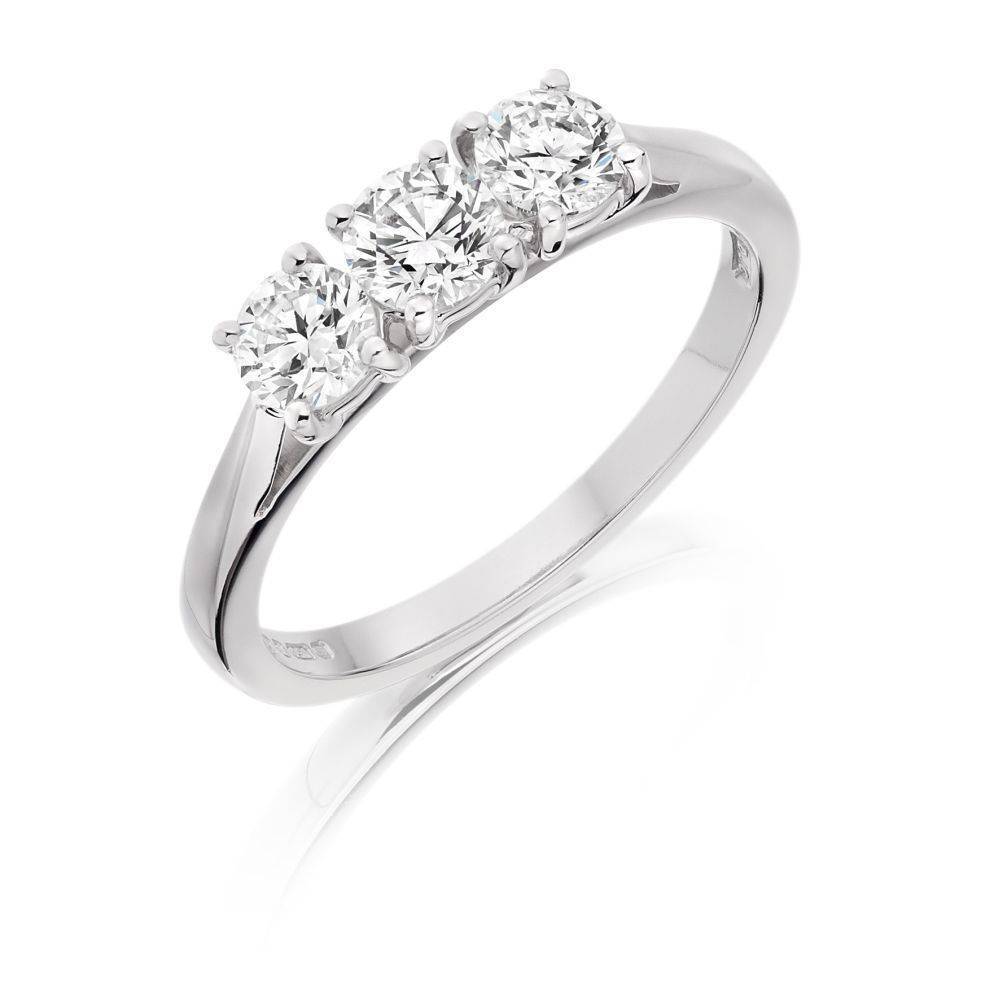 Platinum Three stone round brilliant cut diamond ring with equal sized diamonds totalling 0.30ct, in simple claw set platinum mount. (Image not to scale)