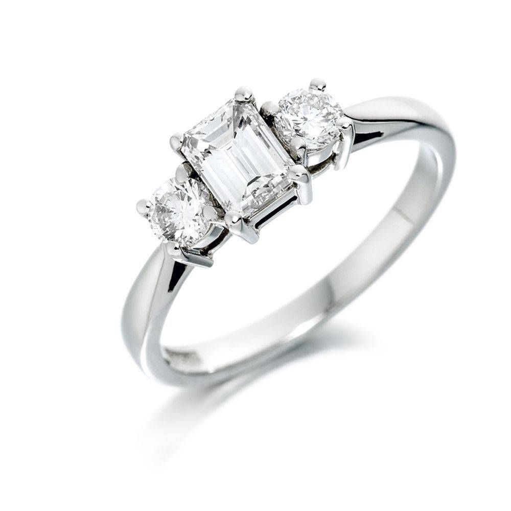 Platinum three stone diamond ring with an emerald cut diamond in the centre and two round brilliant cut diamonds either side in a claw setting. 0.93ct emerald cut centre diamond and 0.54ct total round brilliant cut diamond weight. Total carat weight 1.47ct.