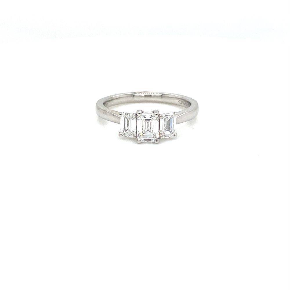 Three graduated emerald cut diamonds sit side by side in a claw setting in a platinum ring mount. 1.00ct total diamond weight. Centre diamond 0.50ct, GIA certificated F colour, Si1 clarity. Two outer diamonds 0.50ct total weight.