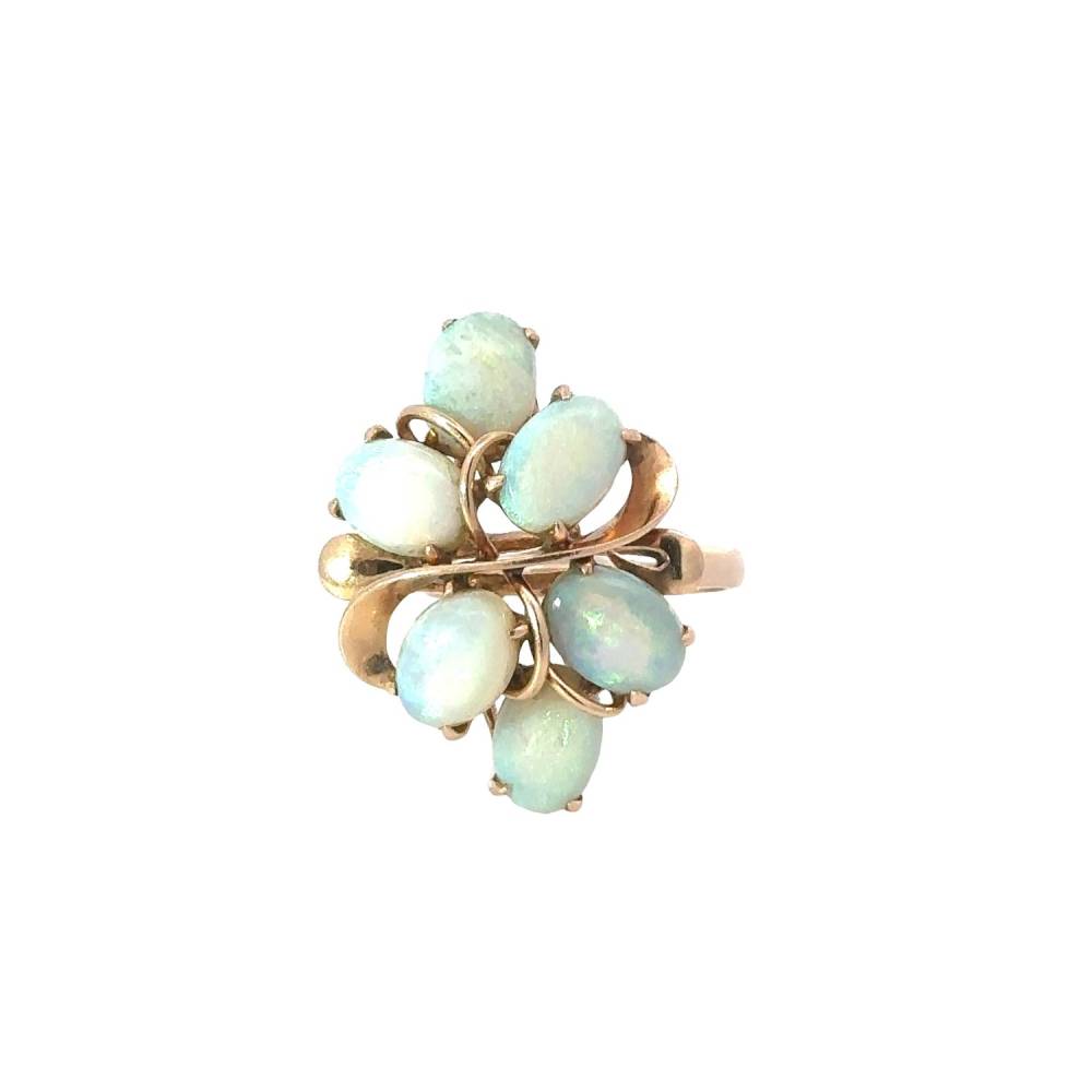 Preowned 14ct yellow gold abstract ring set with six oval opals. Size O1/2. Each opal 7mm x 5mm. Head measures 23.7mm x 18.3mm.