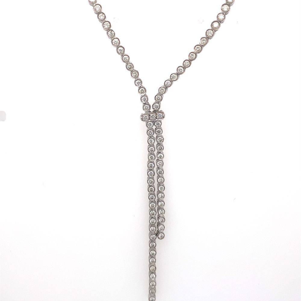 Pre owned 18ct white gold facny diamond necklet with a drop style centre piece. Each diamond is set in a rub over setting and the drop centre makes it sit perfectly on the neck. A beautiful statement piece of jewellery with 2.50ct of diamonds. 109 diamonds in total. 46cm length wiith a 6cm drop centre piece.