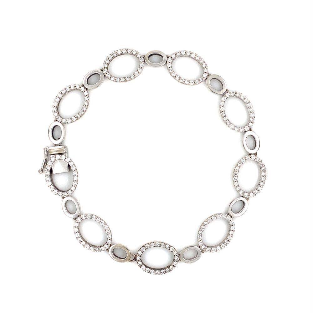 Pre Owned 18ct white gold open oval link bracelet set with round brilliant cut diamonds. This bracelet has a push in catch and safety arm.