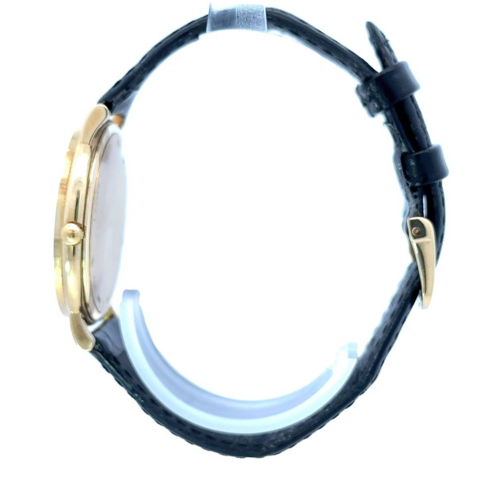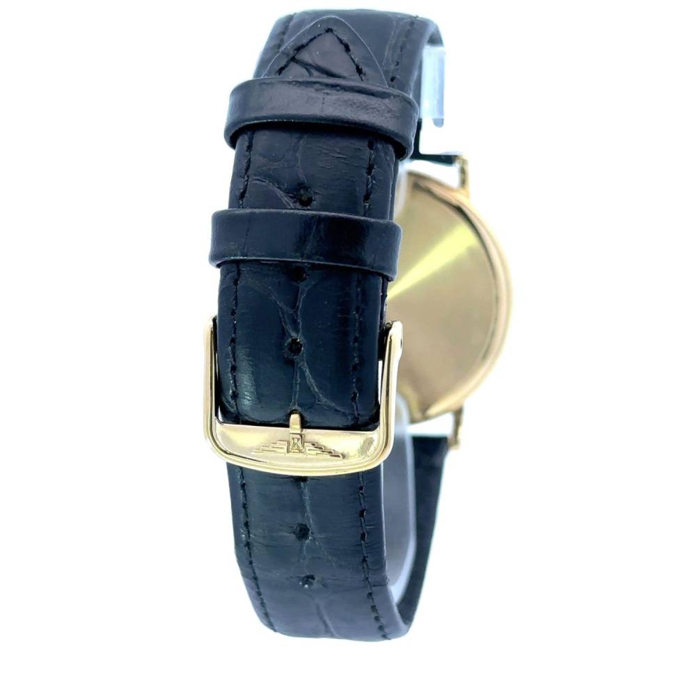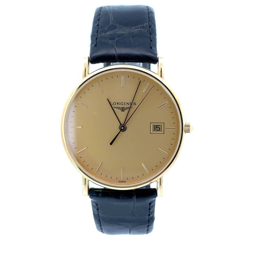 Preowned 18ct yellow gold Longines gents watch with a champagne baton dial on a black alligator leather strap. Case 34mm. Quartz movement.