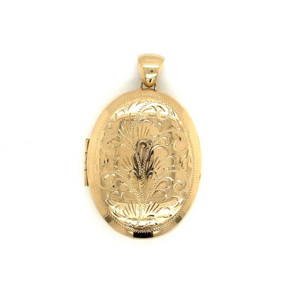 Pre owned 9ct yellow gold large oval locket with a hand engraved pattern and plain back. Approximate size 44mm x 34mm. Weight 16.1g.