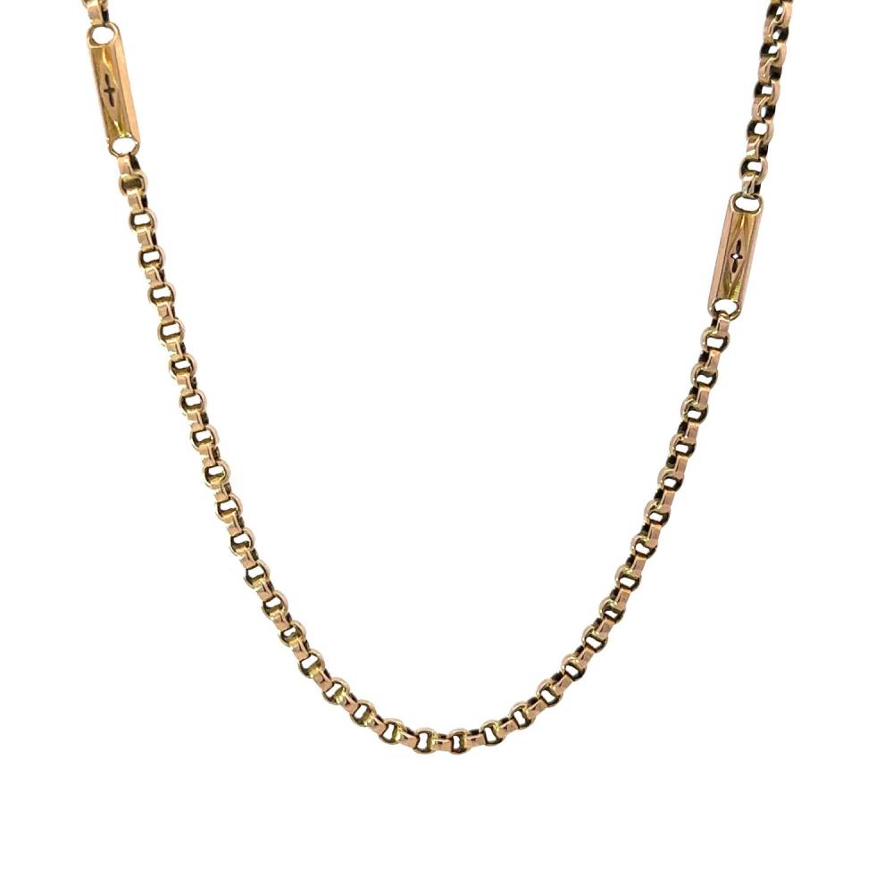 Preowned 9ct rose gold belcher and rectangular station style chain. Length 57cm.