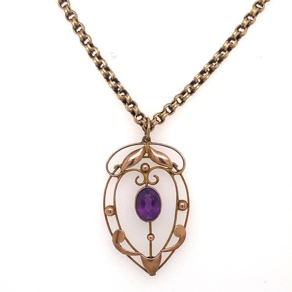 Pre Owned 9ct yellow gold fancy pendant with an oval amethyst in the centre on a 9ct yellow gold chain. Chian length 46cm. Weight 8.7g.