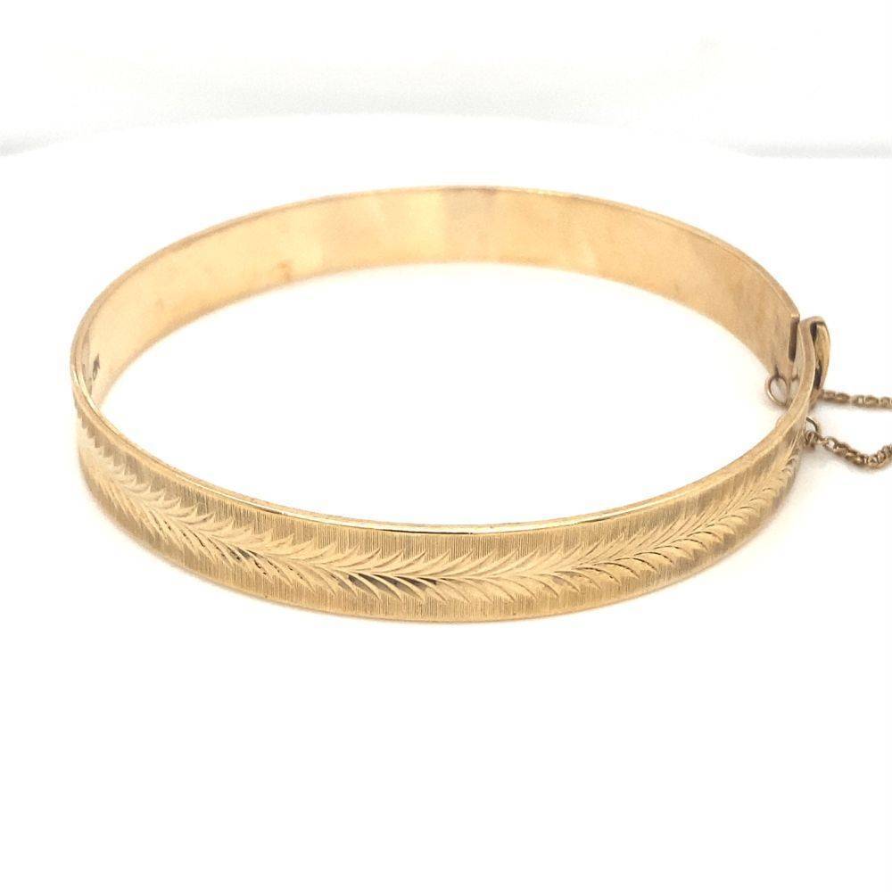 Pre Owned 9ct yellow gold engine turned leaf pattern flat hinged bangle with a safety chain. Weight 15.3g. Internal diameter 56mm x 55mm.