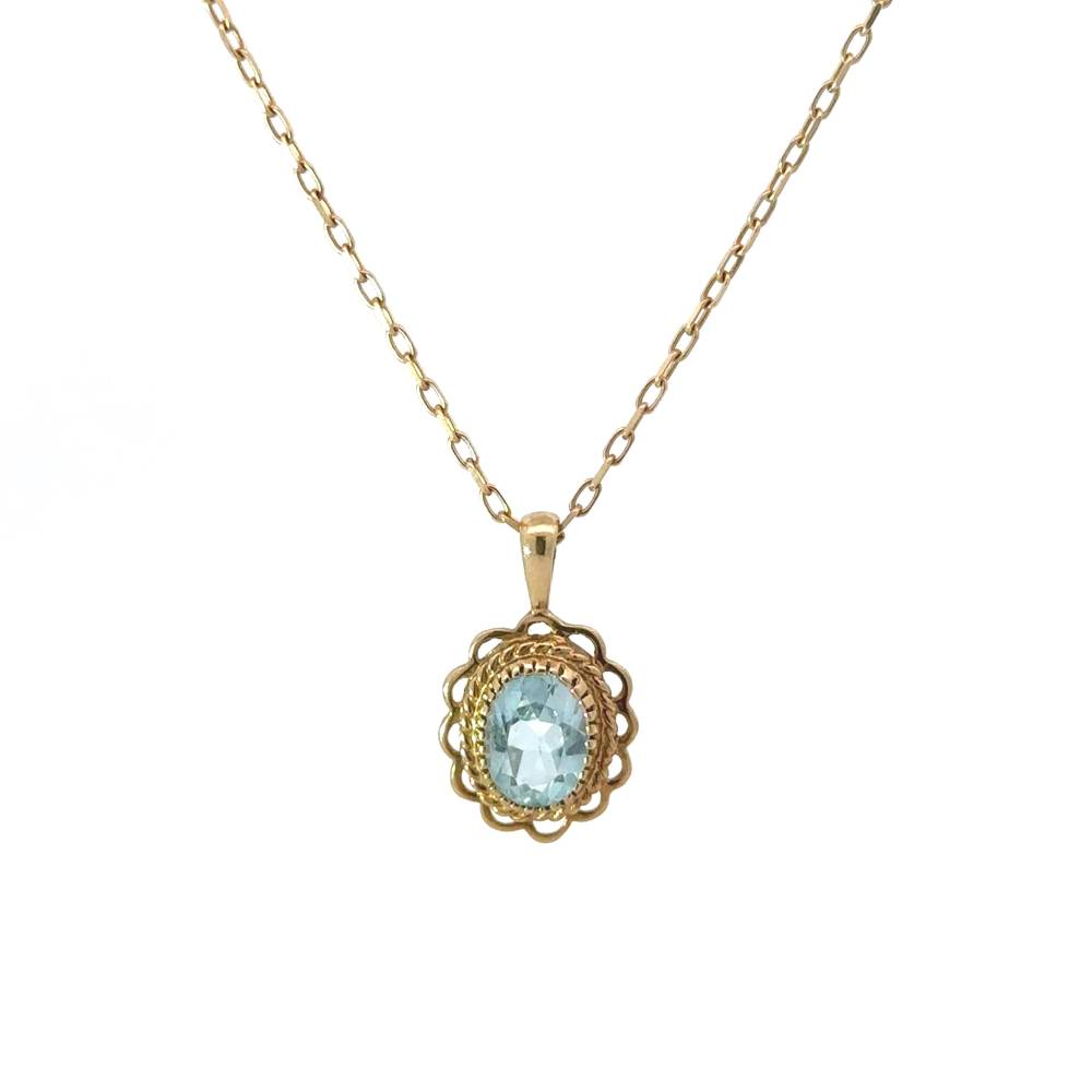 Preowned 9ct yellow gold oval blue topaz pendant with a millegrain setting and an open frilly edge. This pendant comes on a 9ct yellow gold 45cm belcher chain.