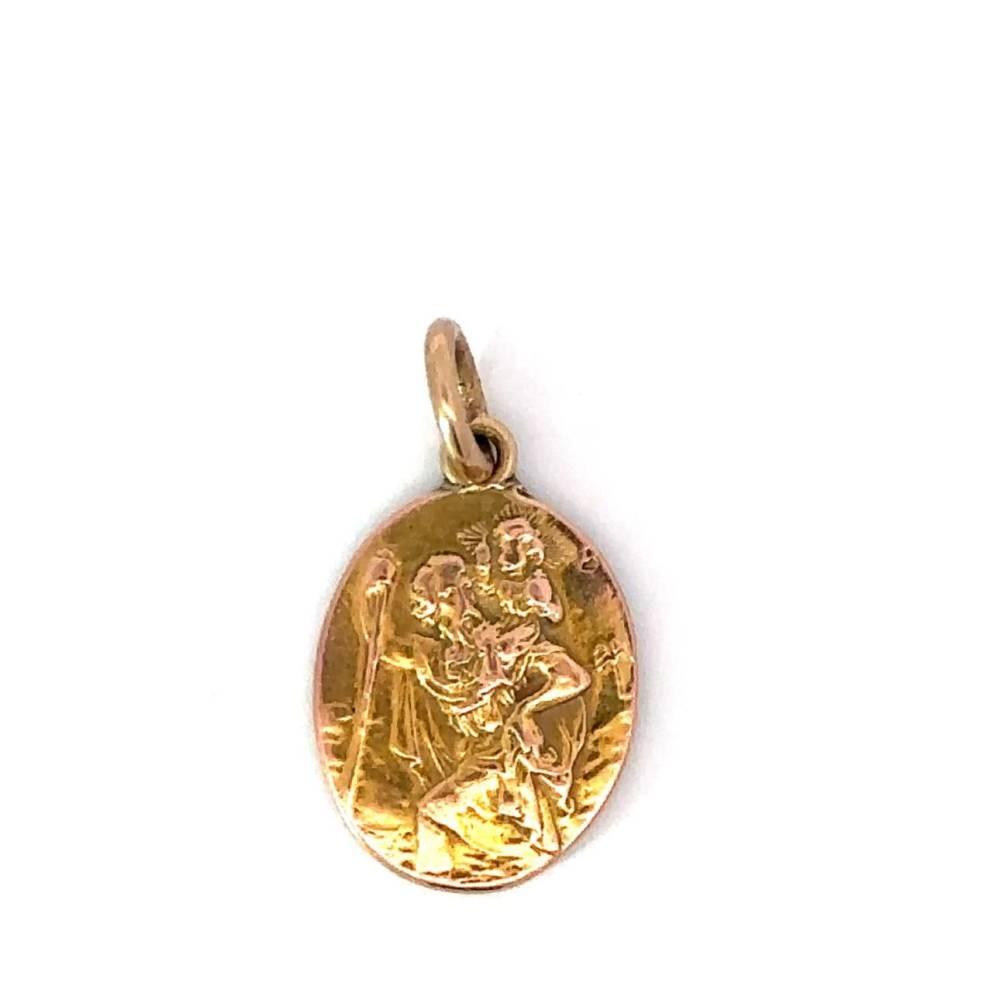 Preowned 9ct yellow gold oval double sided St Christopher. The reverse is engraved with an old car.