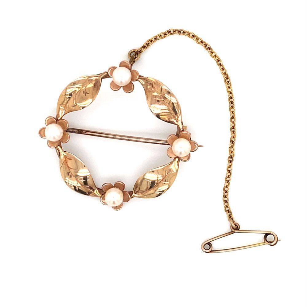 Pre Owned 9ct yellow gold open circular brooch set with four flowers each with a pearl with a leaf between. Safety chain. Weight 4.7g