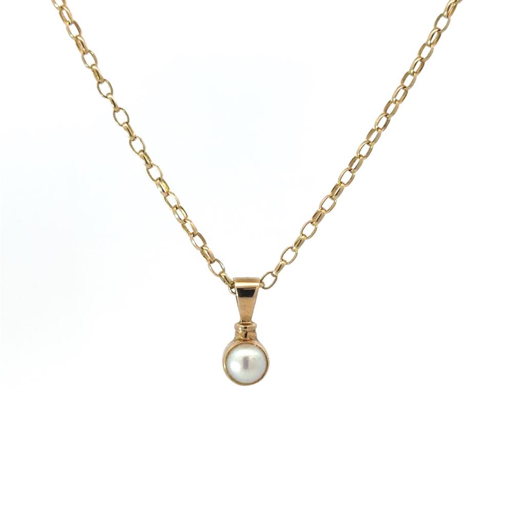 Preowned 9ct yellow gold round pearl rub over set pendant on a 46cm belcher chain.
