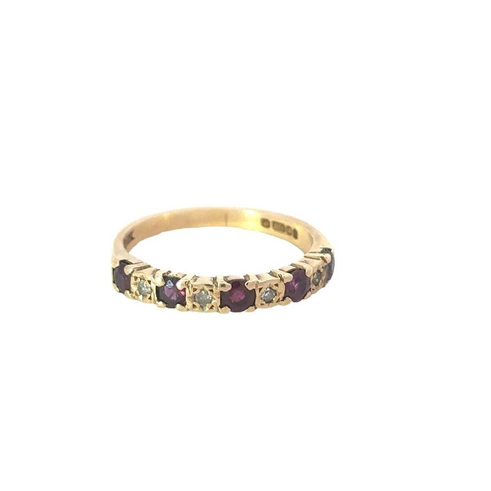 Preowned 9ct yellow gold alternate ruby and diamond half eternity style ring. Size Q.
