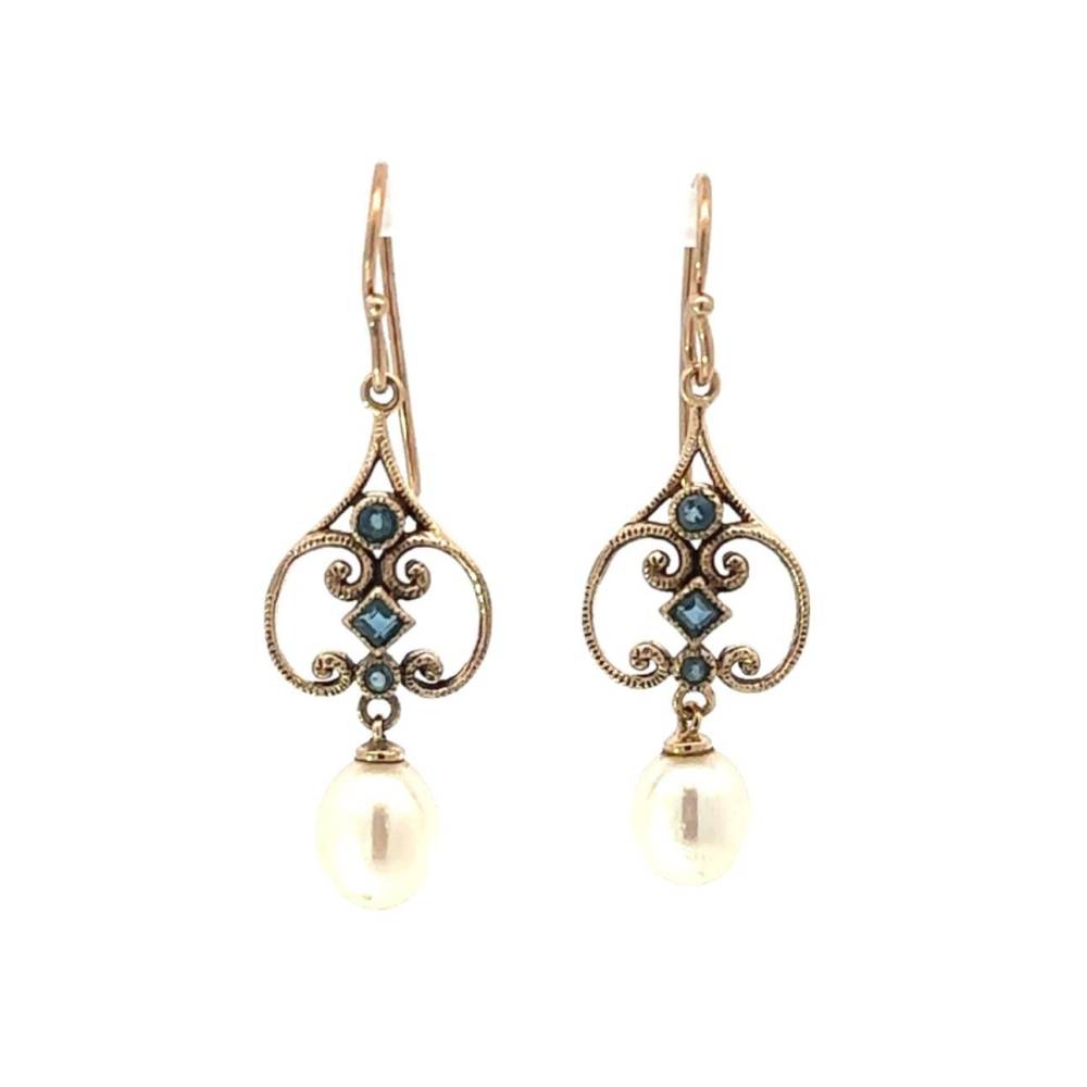 Preowned 9ct yellow gold fancy open design hook through drop earrings set with blue sapphire and a cultured pear. Length 40mm.