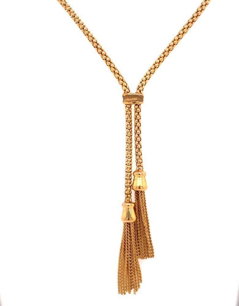 Pre Owned 9ct yellow gold tassle chain necklace. Chain length 17″” with a 3″” drop. Weight 11.4g
