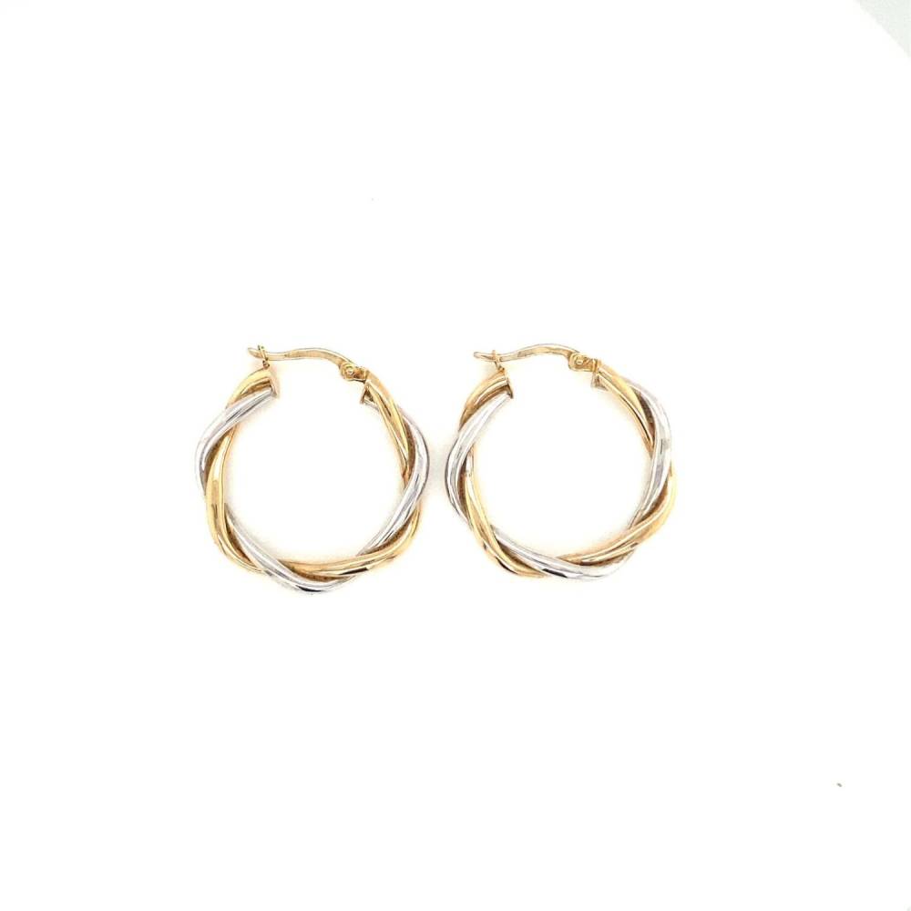 Pre Owned 9ct yellow and white gold twist design hoop earrings with a hinged catch. Approximately 25mm.