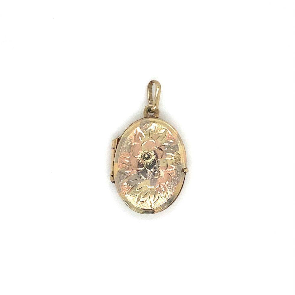 Pre Owned three colour gold, white, rose and yellow gold oval locket with a flower and leaf engraved pattern. Weight 2.8g. Measures 3 x 1.6cm