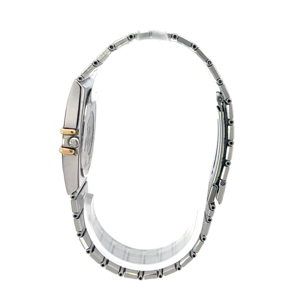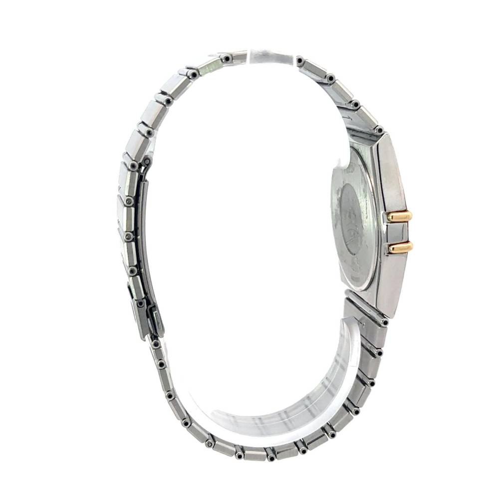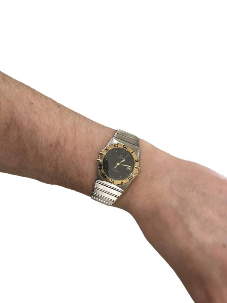 Pre owned stainless steel two tone Omega Constellation watch, black dial with a gold bezel decorated with black roman numerals. This watch comes with an Omega box.