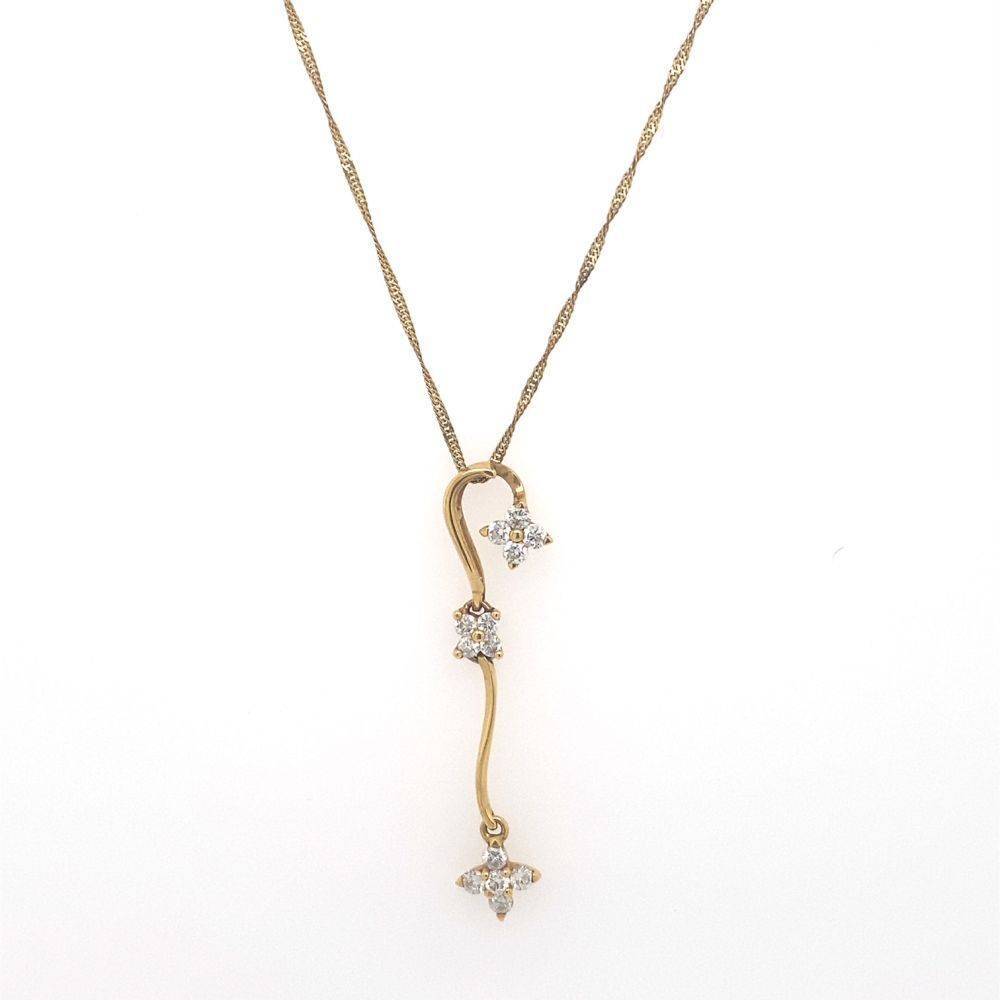 Pre owned 18ct yellow gold drop pendant set with ten round brilliant cut diamonds, eight in two four stone diamond clusters. An elegant pendant on a 9ct yellow gold chain. Chain length 42cm.