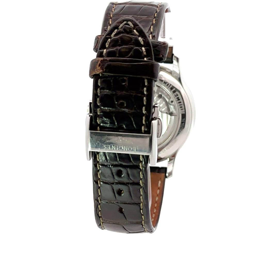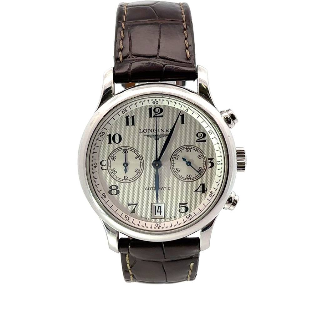 Pre owned Longines Master Collection watch in stainless steel with a cream textured arabic dial on a brown alligator leather double deployment strap. Automatic movement with a see through case back. This watch comes with the box and original papers.