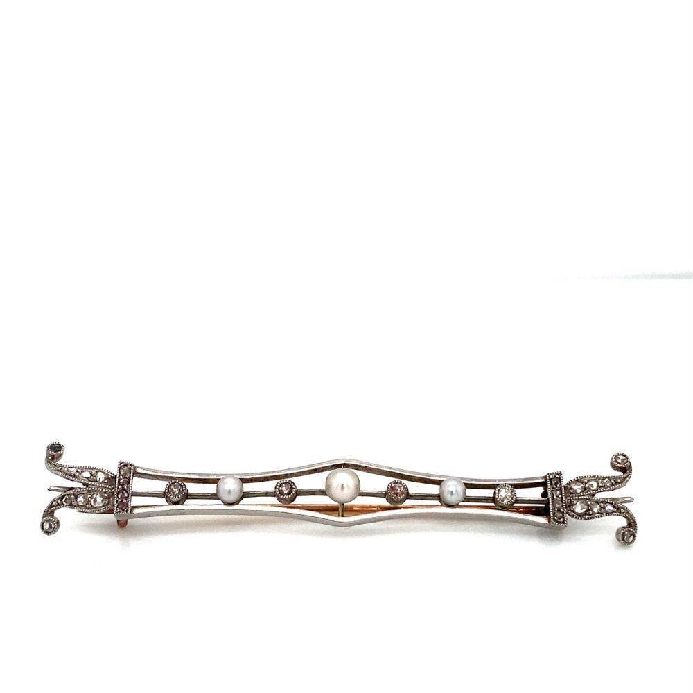 Pre Owned yellow and white gold long pin brooch set with pearls and diamonds.