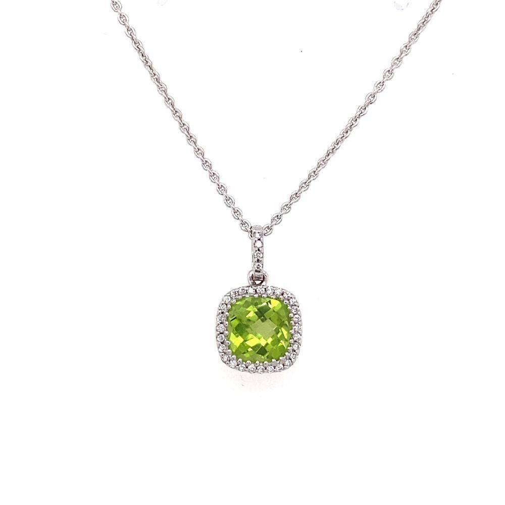 Pre Owned 9ct white gold peridot and diamond cushion shaped halo pendant on a 9ct white gold chain. Chain length 18″”