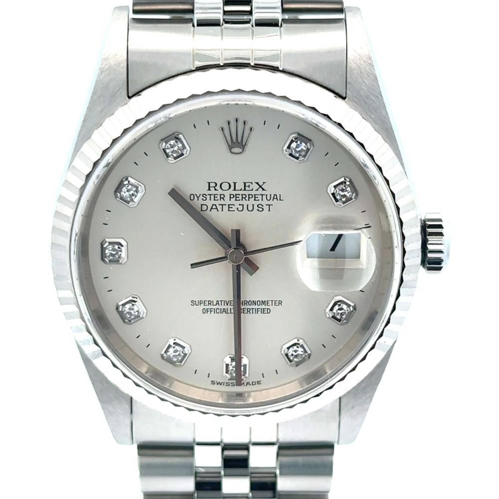 Preowned Rolex 38mm Datejust watch with a fluted bezel and silver diamond dot dial. This watch is on a stainless steel jubilee bracelet. Year 1999. Original papers and a generic box. This watch has been refurbished and comes with our one year warranty.