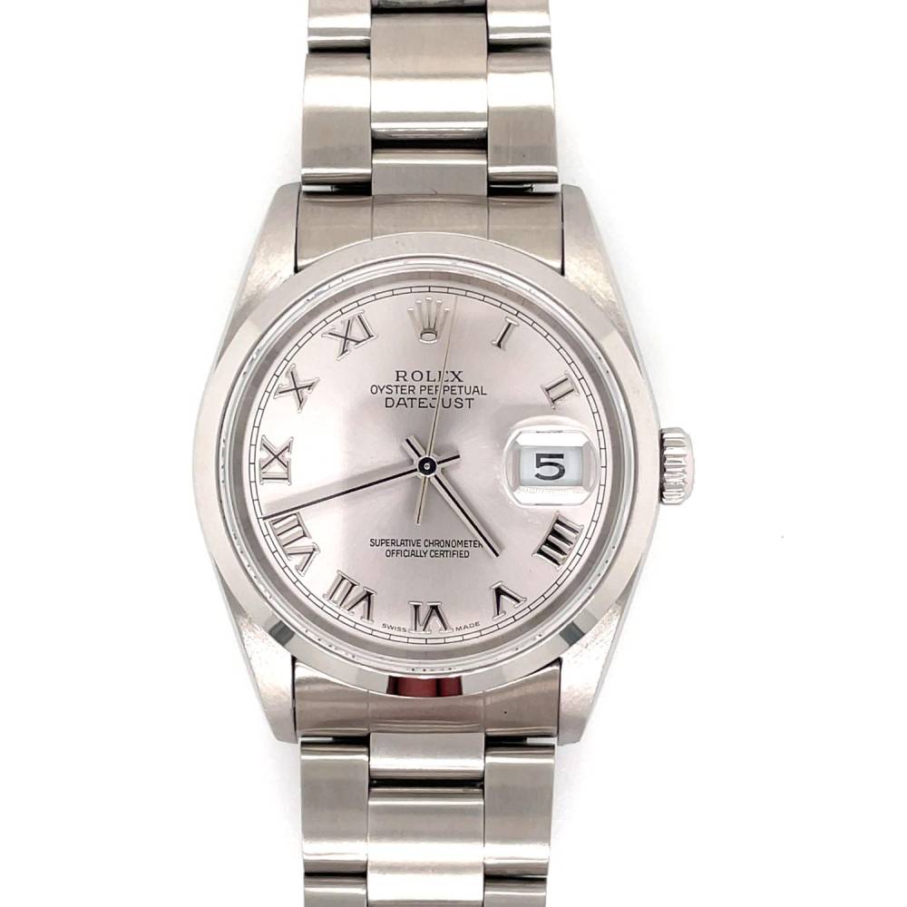 Pre owned gents Rolex Datejust. Silver roman numeral dial on an oyster bracelet. This watch has been fully refurbished and comes with a one year warranty. Year 2005. Original papers and a box.
