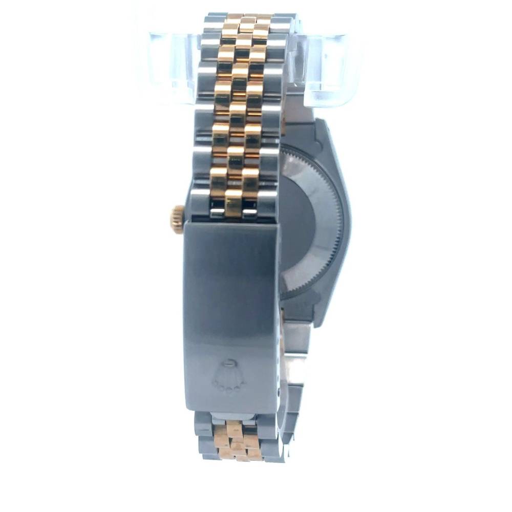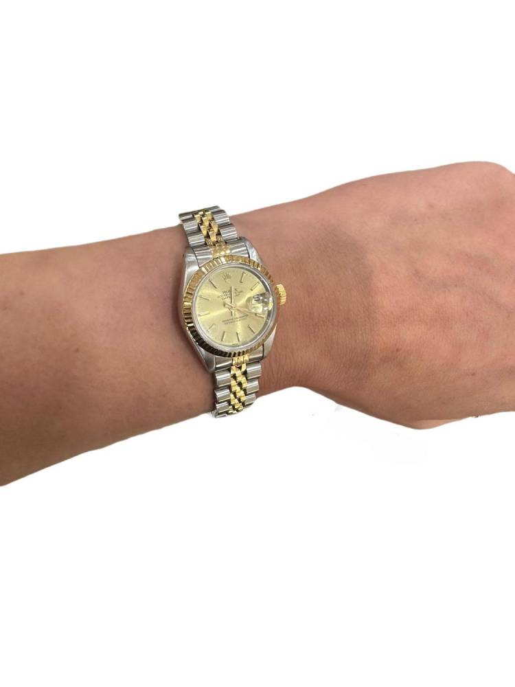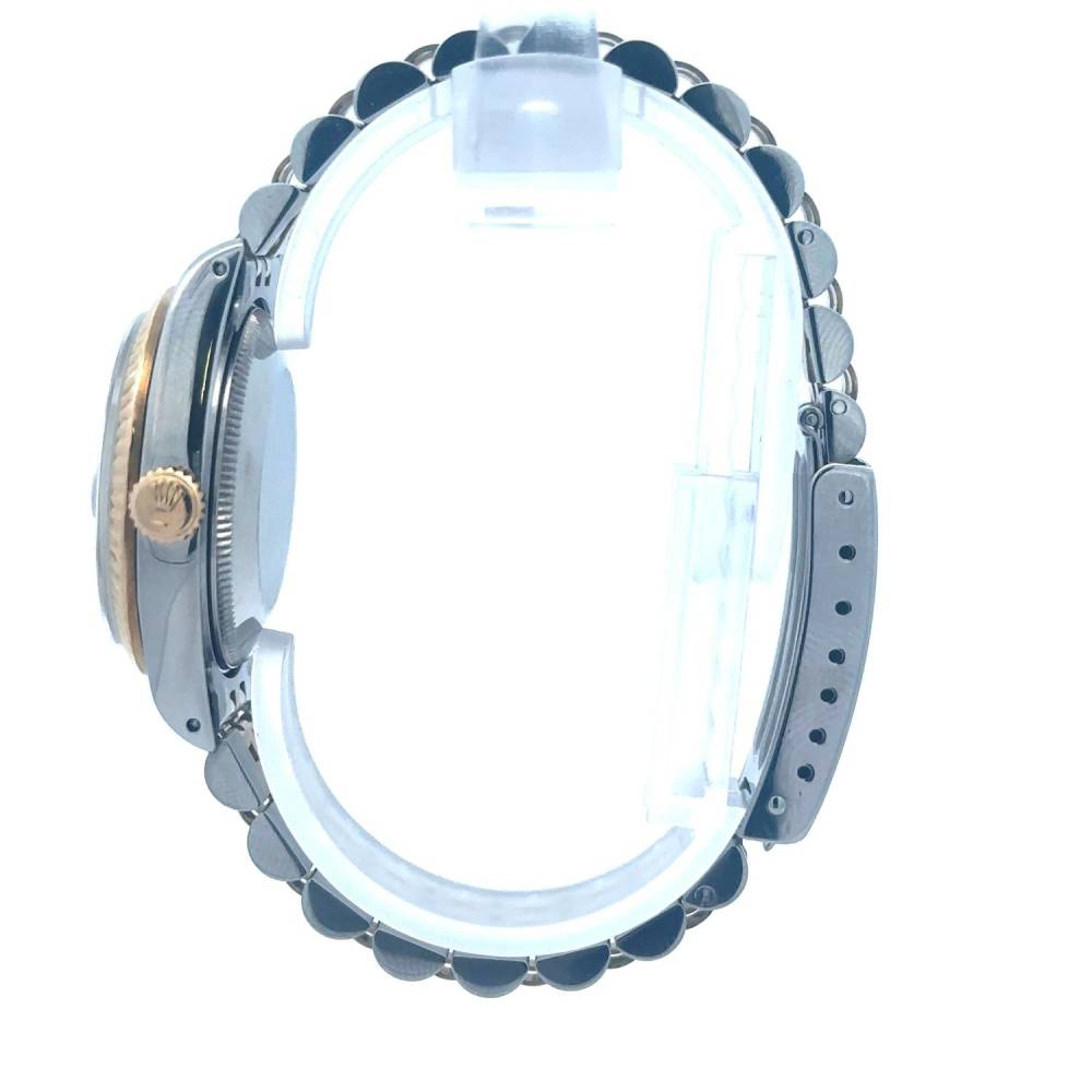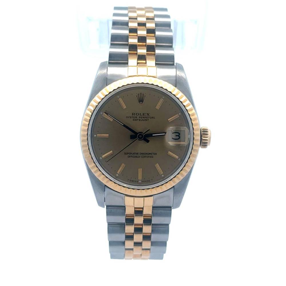 Pre Owned Rolex Datejust watch in stainless steel and 18ct yellow gold. Champagne baton dial with a fluted 18ct yellow gold bezel on a two colour jubilee bracelet Case 31mm. Year 1988. This watch comes with the original papers and a box.